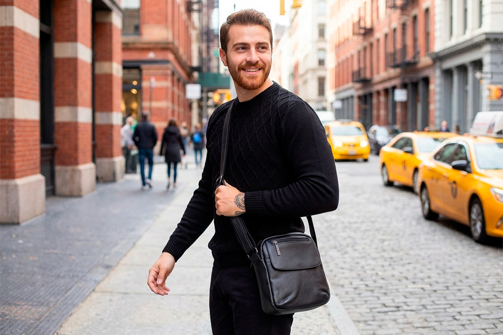 - Uso diário: no cotidiano, opte por uma bolsa masculina transversal de tamanho pequeno, ideal para carregar apenas o essencial, como celular, carteira e chaves. Esse modelo compacto combina muito bem com jeans e camiseta, criando um visual casual e moderno.