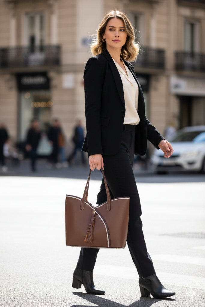 Look com bolsa de couro preta: uma bolsa preta é um clássico que nunca sai de moda. Combine-a com um conjunto de alfaiataria para um visual elegante e profissional, ou com um jeans rasgado e uma camiseta branca para um look despojado e moderno.