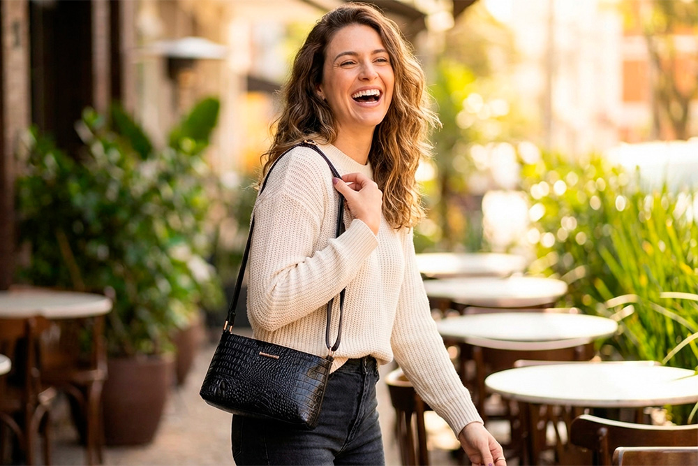 Os acessórios certos refinam qualquer produção de outono, e alguns são indispensáveis para aproveitar a estação com estilo. As bolsas de couro legítimo da Enluaze são resistentes, práticas e combinam perfeitamente com os looks mais sóbrios típicos dessa época do ano. As bolsas transversais de couro entram como opção ideal para quem busca liberdade de movimento sem abrir mão da elegância. Já a clutch feminina de couro é a companheira perfeita para eventos e jantares no outono, quando as temperaturas mais baixas pedem produções elaboradas e cheias de personalidade.
