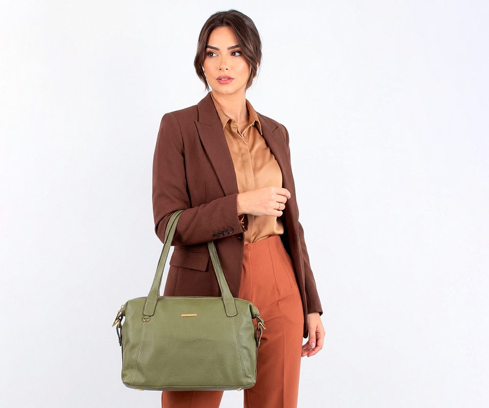 A bolsa verde é perfeita para quem busca ousar e mostrar personalidade. Essa cor vibrante combina bem com tons terrosos e peças brancas, proporcionando um contraste equilibrado que chama a atenção.