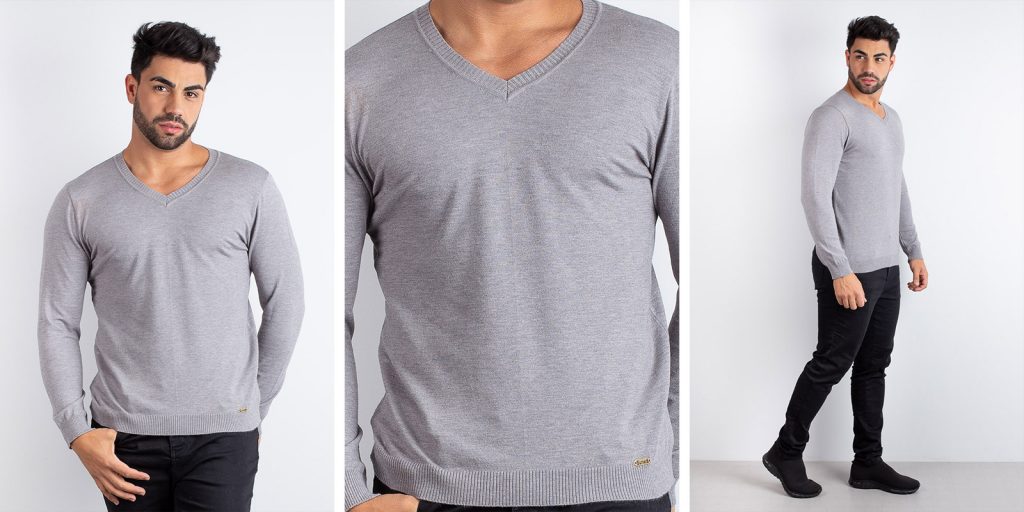 Marcado pelo toque macio, com caimento leve, o suéter masculino de gola V na cor cinza combina com tons suaves de azul claro, gelo, nude e rosa sombra, por exemplo. O fio deste modelo proporciona conforto e versatilidade no uso, pois se molda ao corpo.