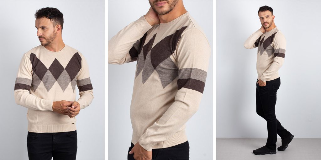 Possui gola redonda e modelos geométricos na parte da frente da peça. Tem como marca a leveza e pode ser utilizado tanto no inverno quanto na meia estação.